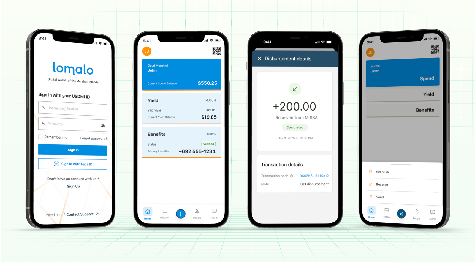 To make nationwide delivery possible, the RMI built Lomalo, an app powered by Crossmint wallets. Lomalo enables residents to receive, store, and use U.S. dollar–denominated tokens directly from their phones, including for citizens without a bank account. Beyond receiving benefits, citizens can transfer funds peer-to-peer to other Marshallese.