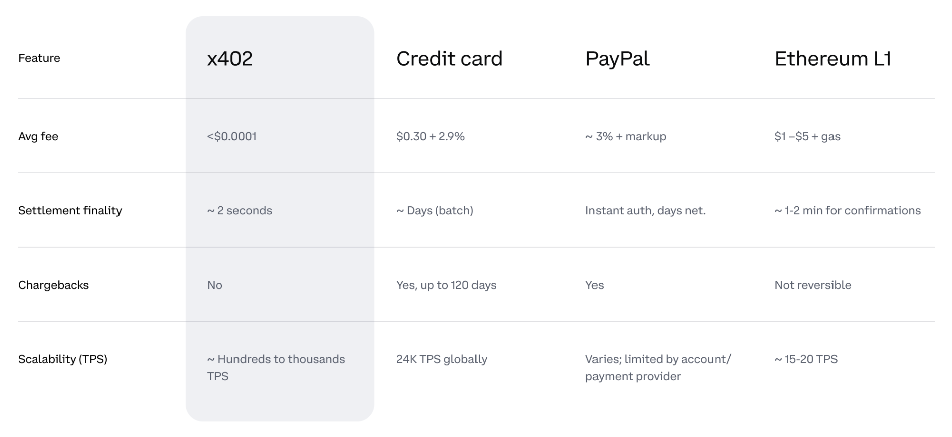 The key differentiator is that x402 is a permissionless protocol, not a centralized service platform. No one outright owns x402. Compare that to Stripe, where you're dependent on a single company's infrastructure, pricing, and terms.